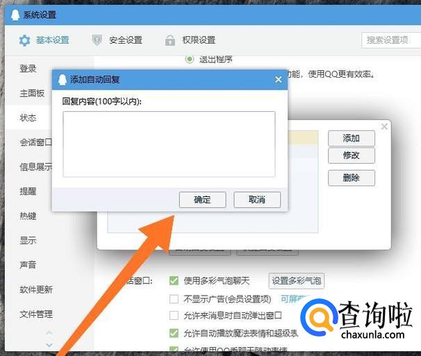 最后输入自动回复的内容,点击“确定”即可。需要注意的是自动回复的内容要在100字以内。