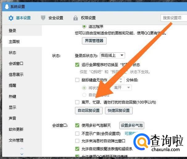 再点击进入“自动回复设置”。勾选“离开、忙碌、请勿打扰时自动回复”选项后,自动回复即可生效。