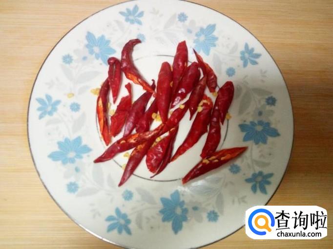 红干椒用水清洗干净,控干水分,斜刀切成段。