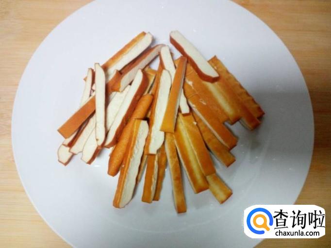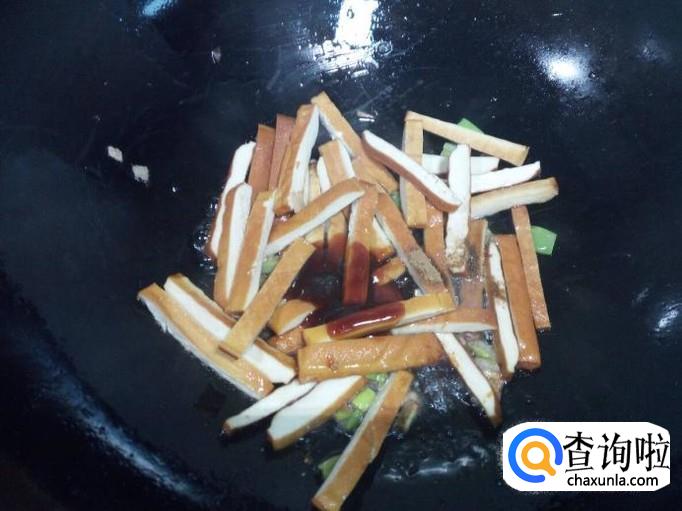 放入五香粉,少许料酒,一匙儿蚝油翻炒。放入少许水,这样翻炒出来的豆干比较软。