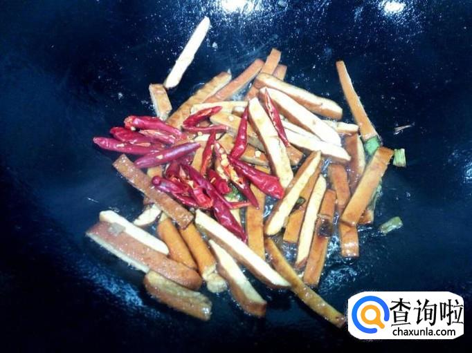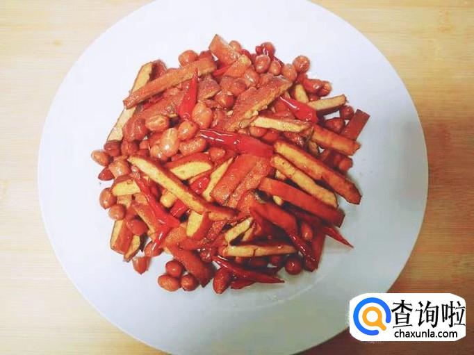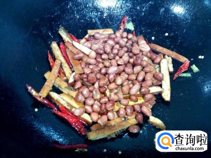 炒至豆干变软,放入红干椒翻炒。红干椒略翻炒一下,放入少许盐翻炒,放入少许味精,关火。然后放入炒熟的花生米稍翻动一下,出勺。