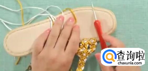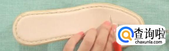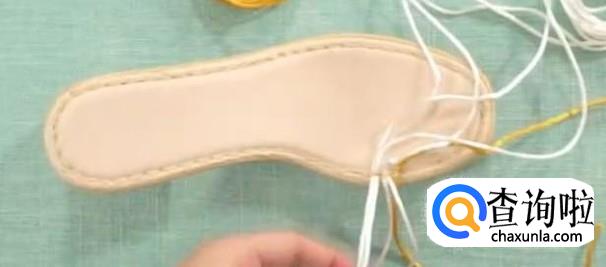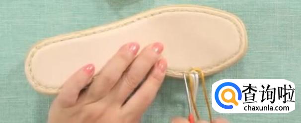 下一步,把线穿到鞋底。把这个线穿过来。借助直钩型锥子,穿过鞋底。这里穿过来的线往下按,钩子嘴朝上。重复直至全部线穿过即可。