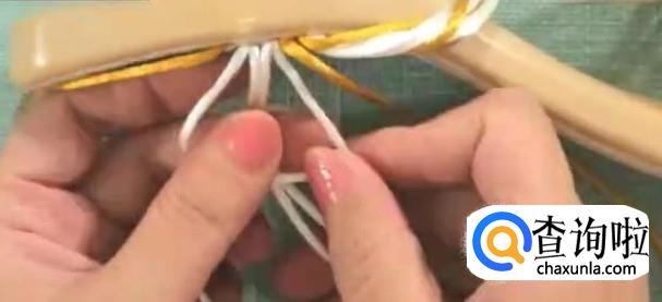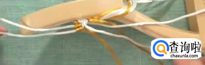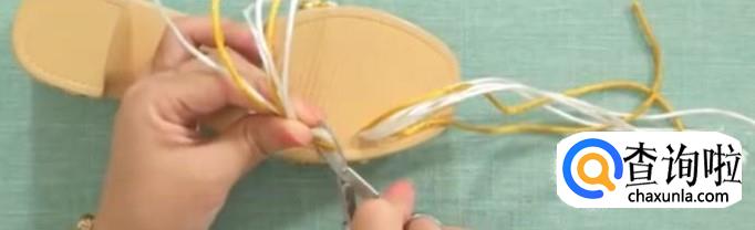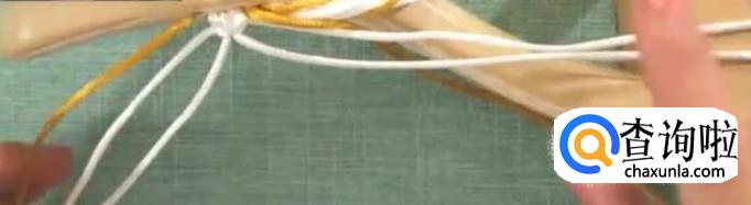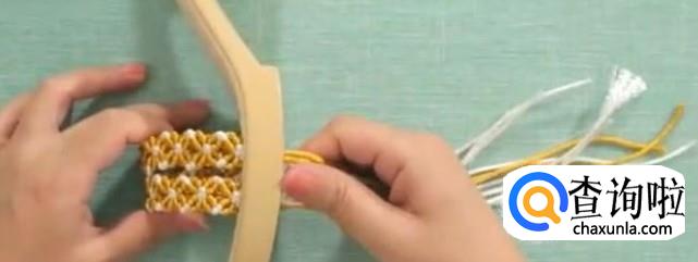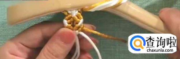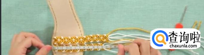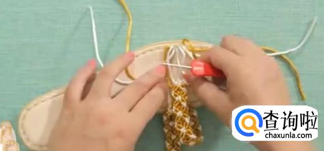 第二部,打结。先把内侧的线打结,放在一边。中间白色芯线打一组平结。四根白线,对半分开。第一根作为轴线,黄色作为卷线,打第一组斜卷。第二组同样,重复多次直至结正好。这是完成的第一个单元花。以此进行第二个单元花。用同样的方法,把鞋面的长度编到12厘米。这里的长度是由脚背的高低来决定的。后面一排比前一排多打一个单元花。