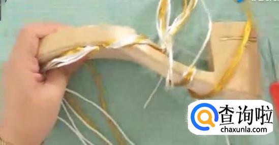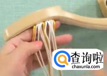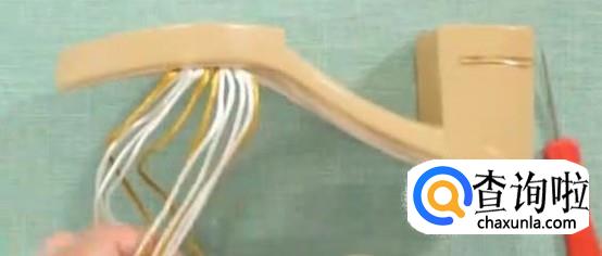 第一步,挂线。起步位置4.5厘米。借助普通钩针,从边上小孔两种颜色线穿插穿入。第一组完成,每组线挂两针,都是三根线。第二组和第一组有所间隔,跳到下一针的位置,两组线挂好,结束。