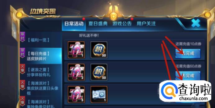 上步骤所说的活动会持续大概好几天,玩家可以通过每天充值一块钱获得30积分和一块皮肤碎片。每个月都有这种活动大概2-3次,通过一直的小额充值和抽取就可以在短时间之内获取武则天。此外,充值的点券还可以拿去购买自己其他喜爱的皮肤,用抽奖获取的大量皮肤碎片换取皮肤。