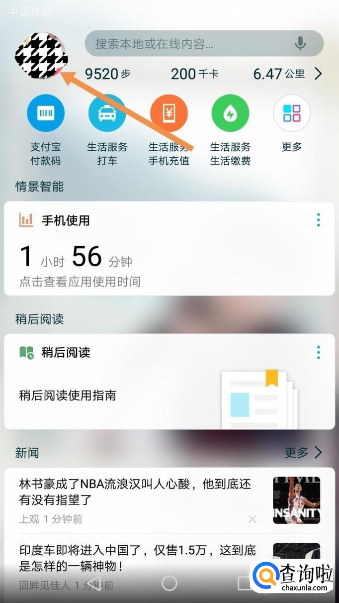 首先在手机屏幕首界面往右拉,出现自己的账号信息,然后点击头像,如下图。