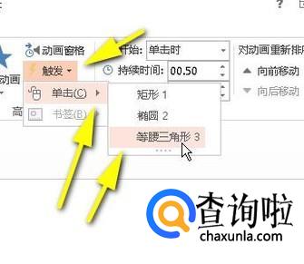 接下来,制作触发器。当点击三角形时,矩形飞走。
