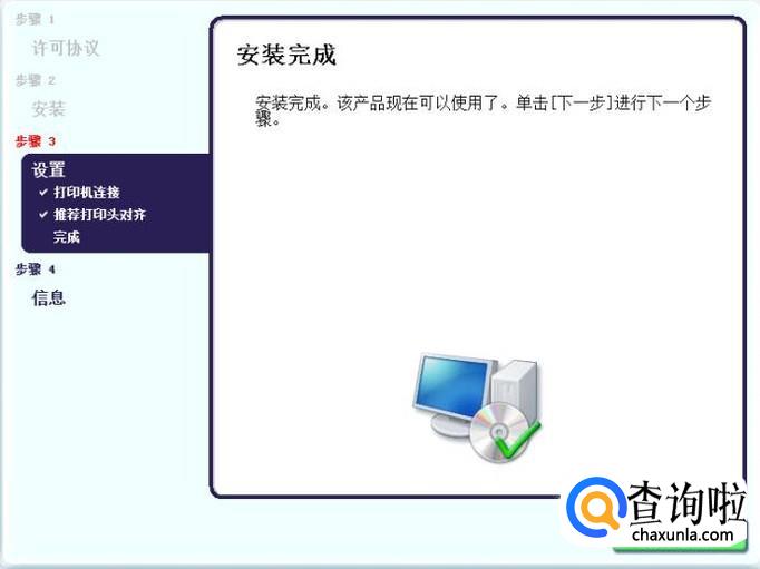 点击安装之后,就会执行安装程序,这个过程大概得几分钟,等进度条结束后,会提示打印机连接,此时,把打印机加电,并连接电脑。