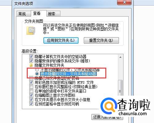 切换到【查看】,往下滑动,选择【显示隐藏的文件、文件夹和驱动器】,最后点击确定即可恢复。