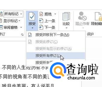 点击“接受”后,弹出下拉菜单,再点:接受所有修订