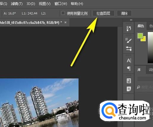 接着,鼠标再移到上面属性栏这里,点击:拉直图层;如图所示。