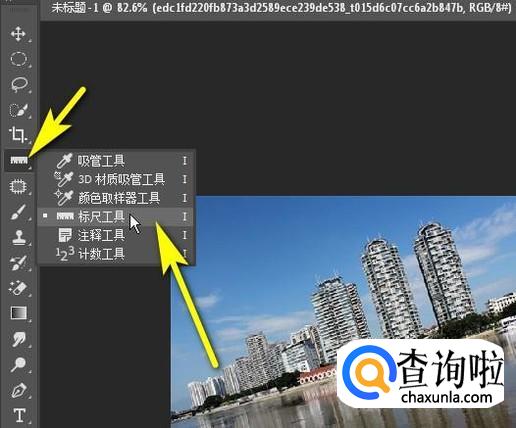 鼠标移到工具栏这里,如图所示,鼠标长点住吸管图标,在弹出的工具选项中选择:标尺工具