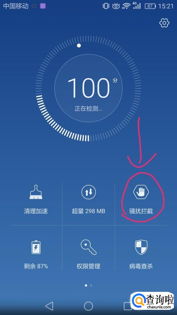 进入手机管家页面后,点击骚扰拦截。