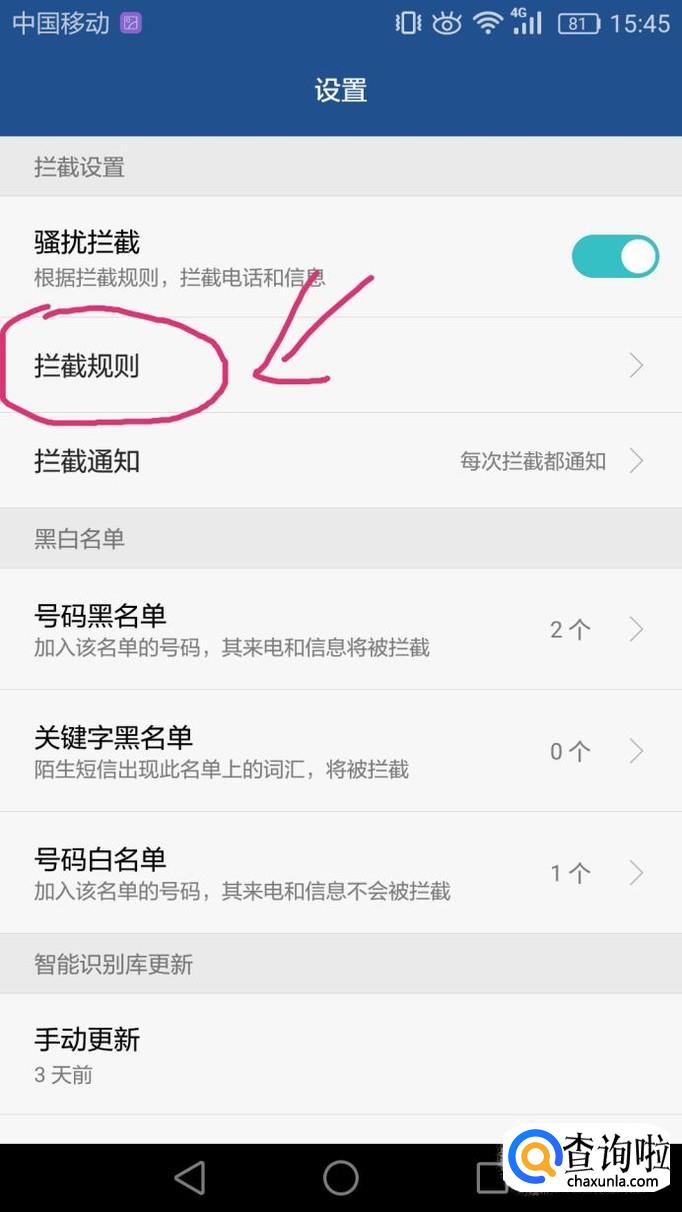 在页面中,先打开骚扰拦截,然后选择拦截规则。