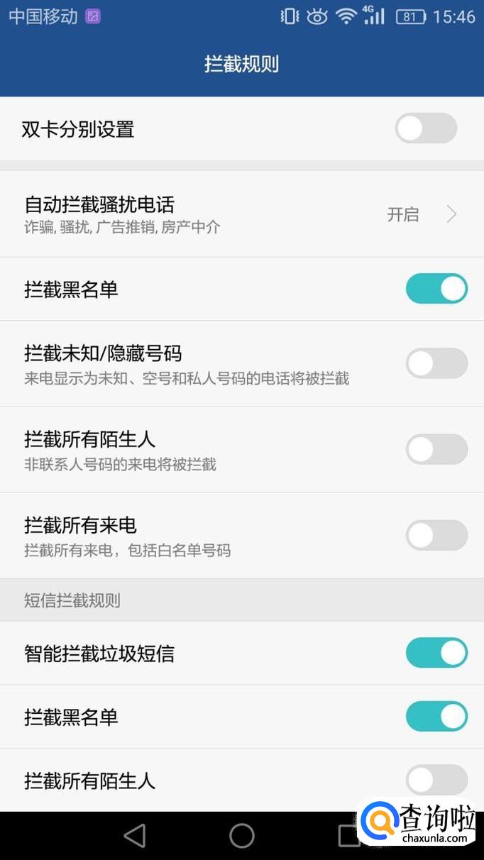 我们就可以设置是否拦截全部骚扰短信。并开启智能拦截,按自己的需要设置即可。