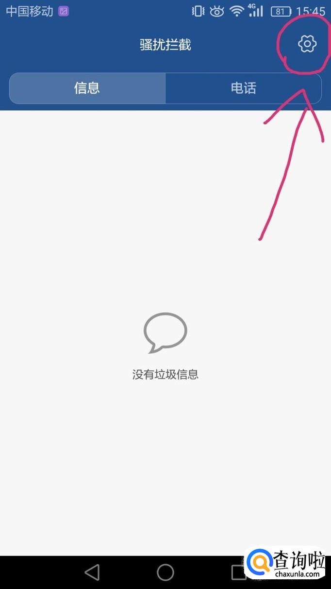 进入骚扰拦截页面,在页面右上角点击设置图标。