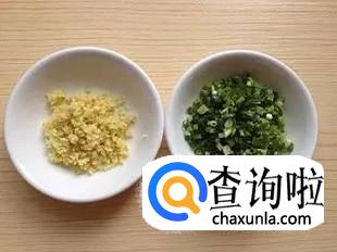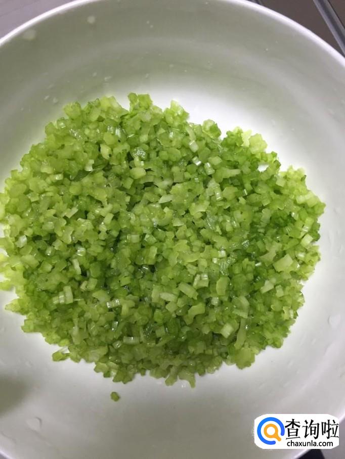 将胡萝卜切成丁然后剁成沫,西芹也切成沫,西芹比容易熟就不用烫熟了,葱切成葱花,姜切成姜末备用