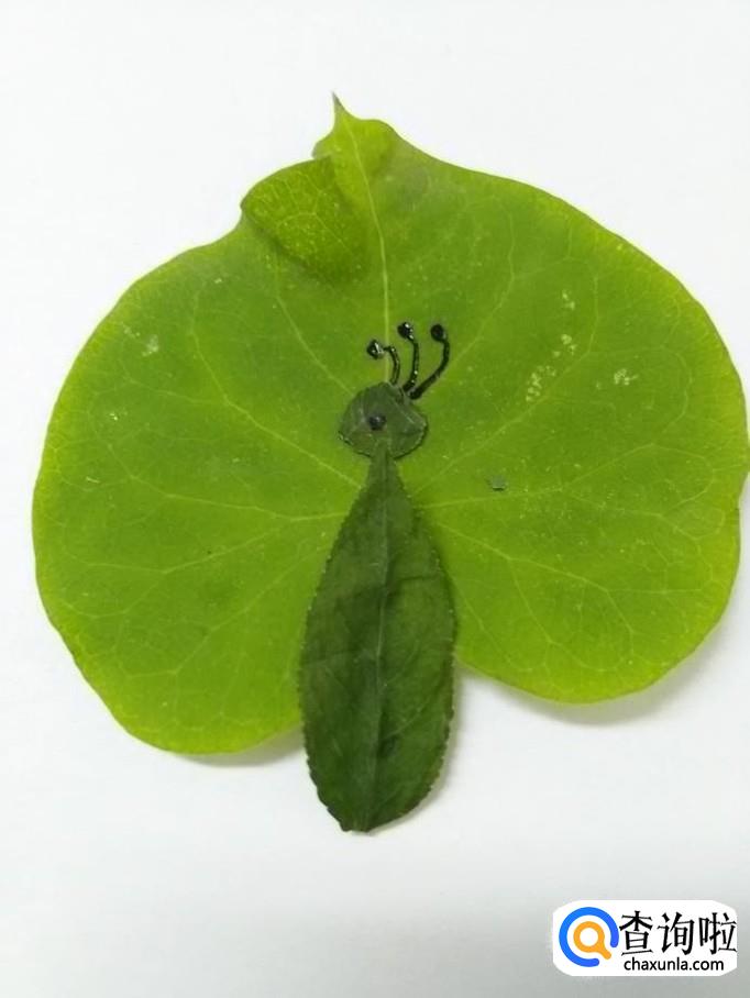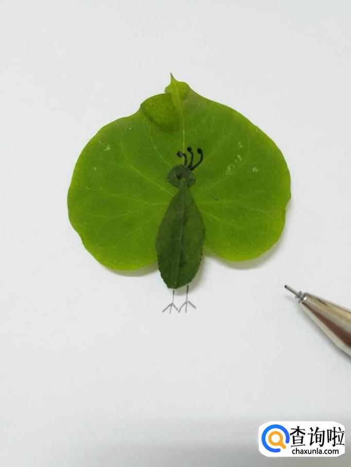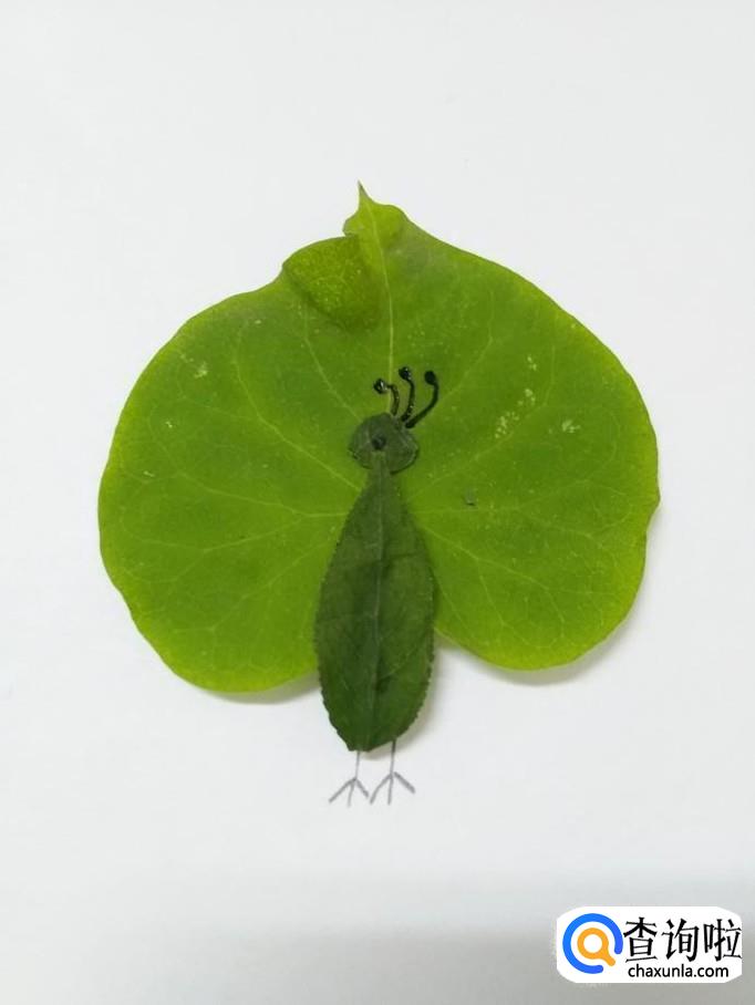 最后用笔在孔雀身体下面写两个小字,表示孔雀的腿和爪子,树叶孔雀就做好了。