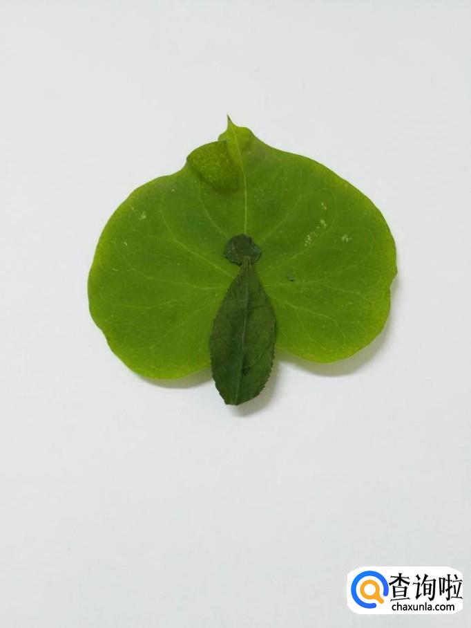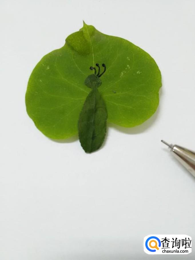 再用一片深颜色的小叶子粘在头部下面,当做孔雀的身体。