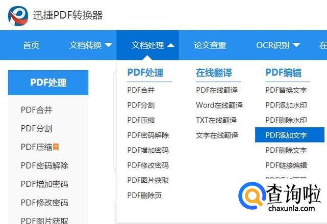 进入在线操作界面后。在栏目中中找到文档处理下的PDF编辑并点击PDF添加文字
