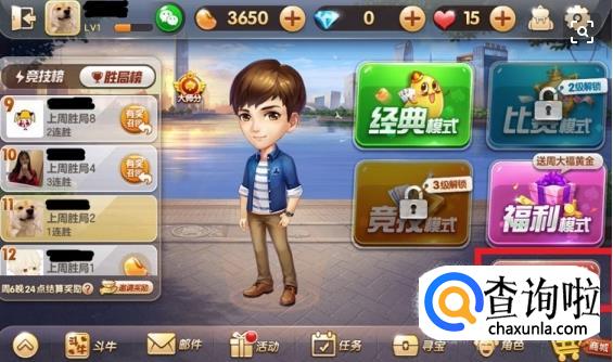 打开手机版QQ欢乐斗地主,登录后,来到主界面,因为要创建房间,所以点击右下角的“好友同玩”按钮,经典模式,比赛模式,经济模式和福利模式都是直接进入别人间房。
