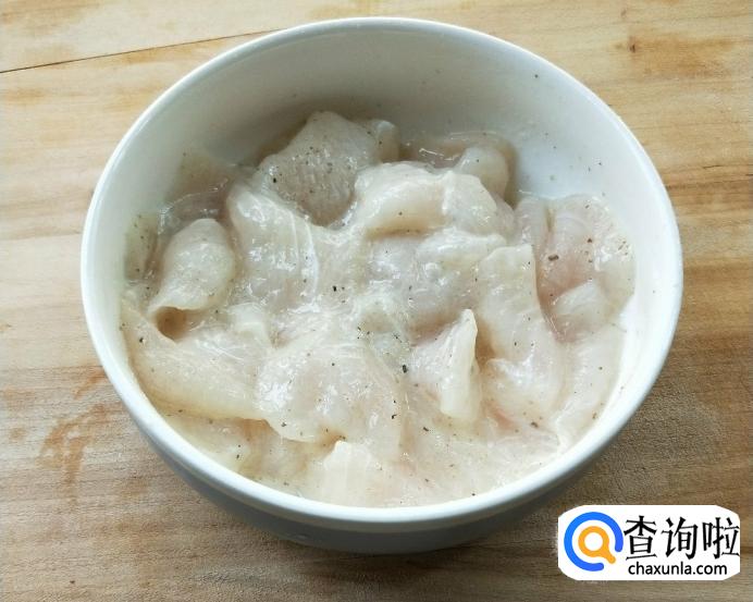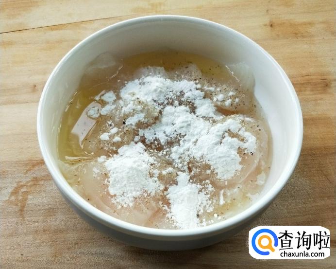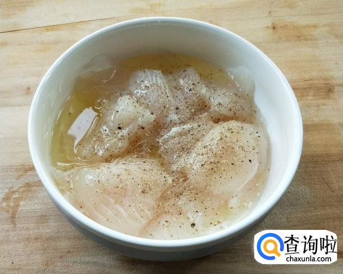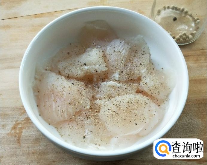 鱼片加入适量盐、现磨白胡椒粉、蛋清、淀粉。