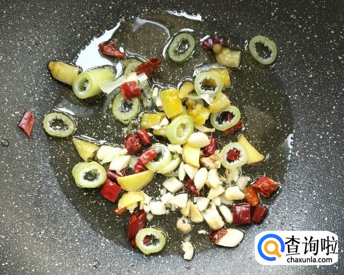 锅内倒入食用油,待油温6成热时放入放切好的葱姜等配料。