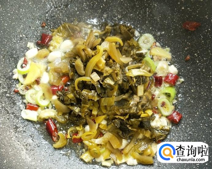然后倒入酸菜,炒制3-5分钟。