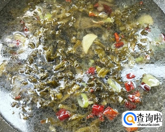 等锅中炒出香气以后,加入适量开水,少许鸡汁。水开以后煮5~6分钟,加盐和味精调味。用漏勺捞出酸菜放入碗中备用。