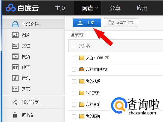 打开网盘后,点击【上传】,在电脑中找到自己下载的视频,点击确定,之后就可以在百度云进行观看了。