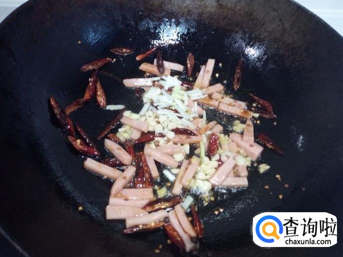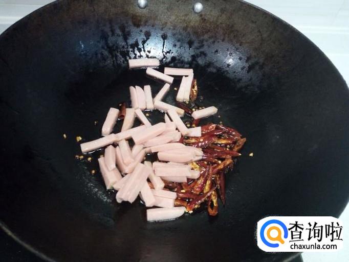锅内放入油加热,油热后放入花椒,红干椒爆香,放入火腿肠小火翻炒。