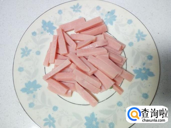 火腿肠去掉外包装,用刀切成条。