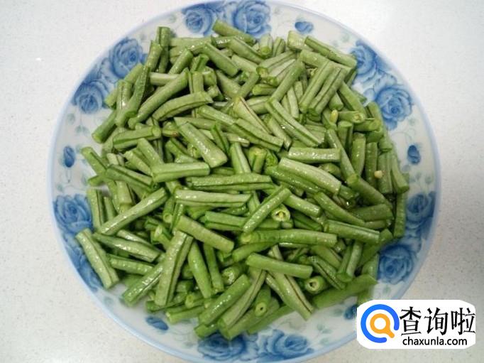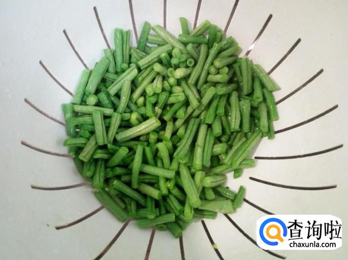 豇豆用开水焯一下,入锅30秒钟捞出,迅速用冷水过凉,控干水分。