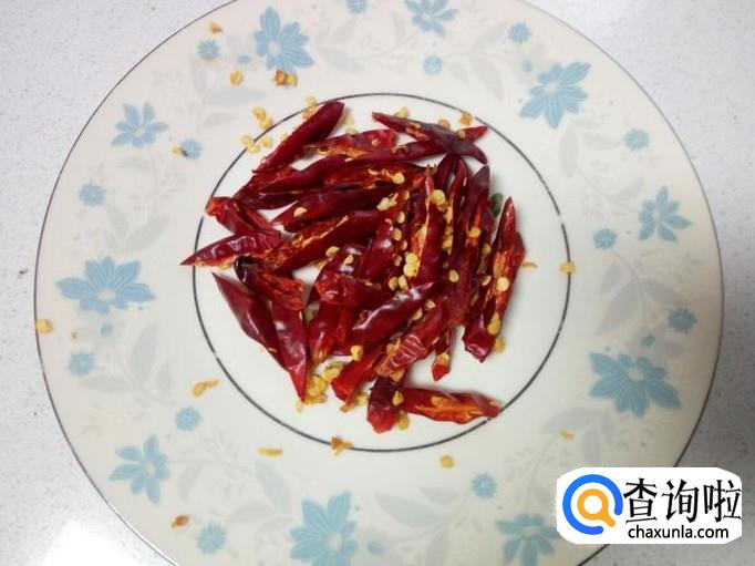 红干椒用水清洗干净,控干水分,斜刀切成段。切好葱,姜,蒜,备用。