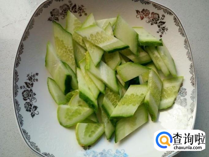 黄瓜用水清洗干净,控干水分,切成片。