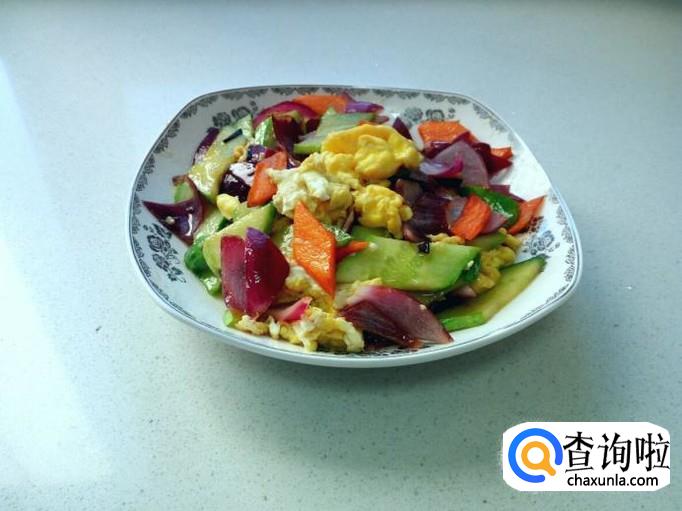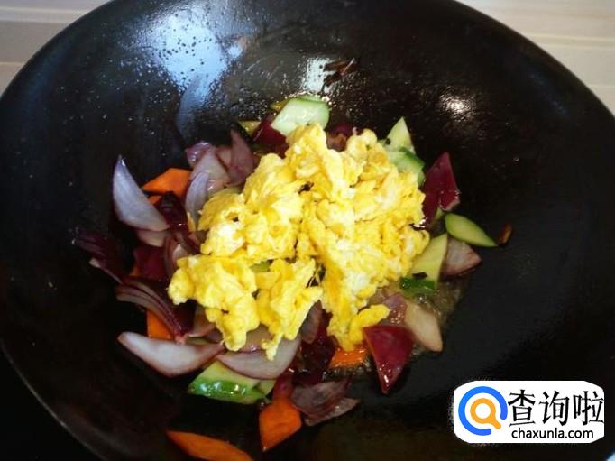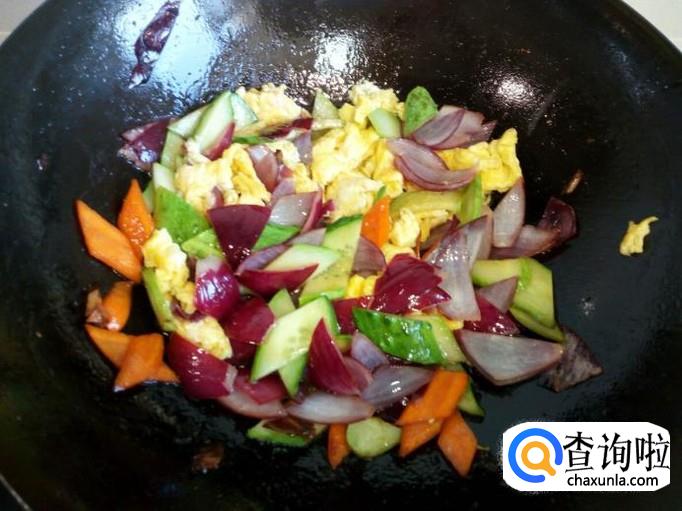 圆葱,黄瓜片炒至断生,放入炒好的鸡蛋,略翻炒一下,放入味精,关火出勺。