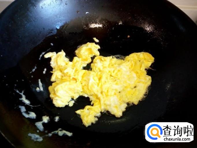 先用锅把鸡蛋炒出来,炒至七分熟,盛出备用。