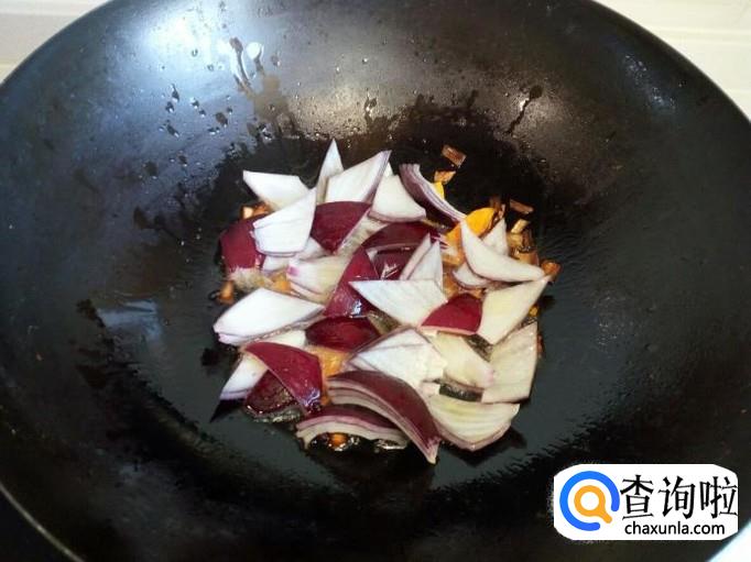 放入圆葱大火爆炒,放入少许料酒,滴少许醋。圆葱炒至六分熟,放入黄瓜片翻炒,放入盐。