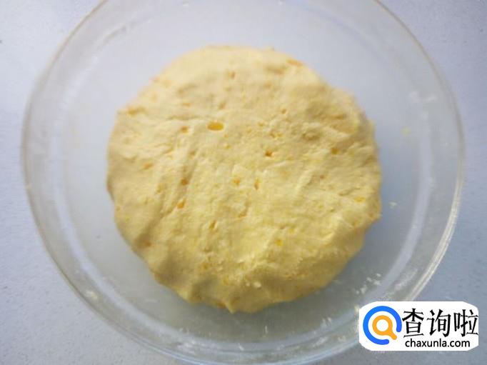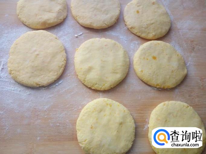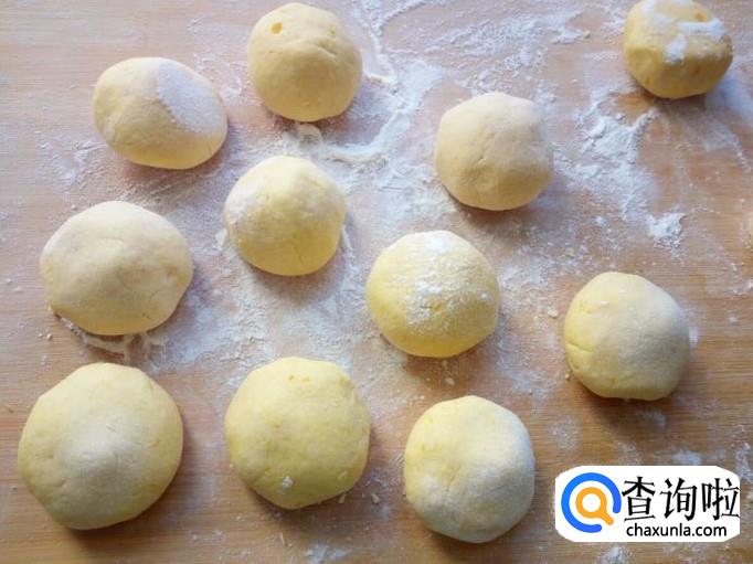 把揉成的面团,用手揪成小块,然后搓成圆形,再按压成饼状。