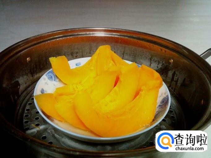 把切好的南瓜上锅蒸熟,大概蒸20~25分钟的时间,用筷子插一下,能插透即可。