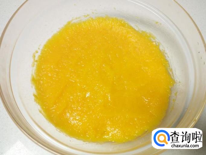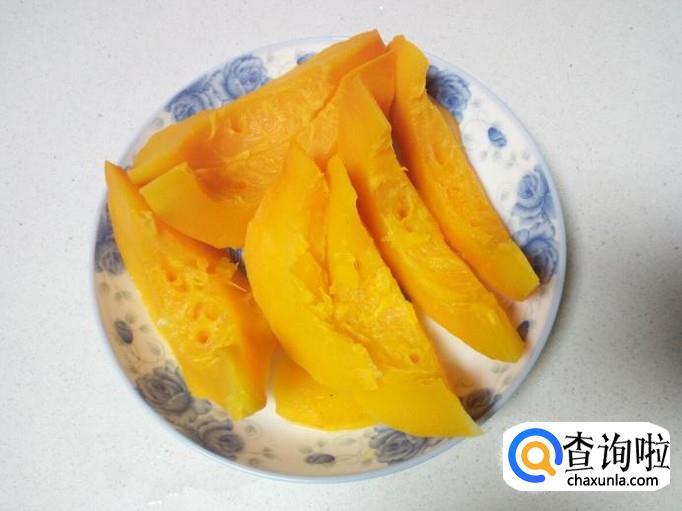 南瓜蒸熟后,稍凉一会,然后用匙儿捣碎成泥状。
