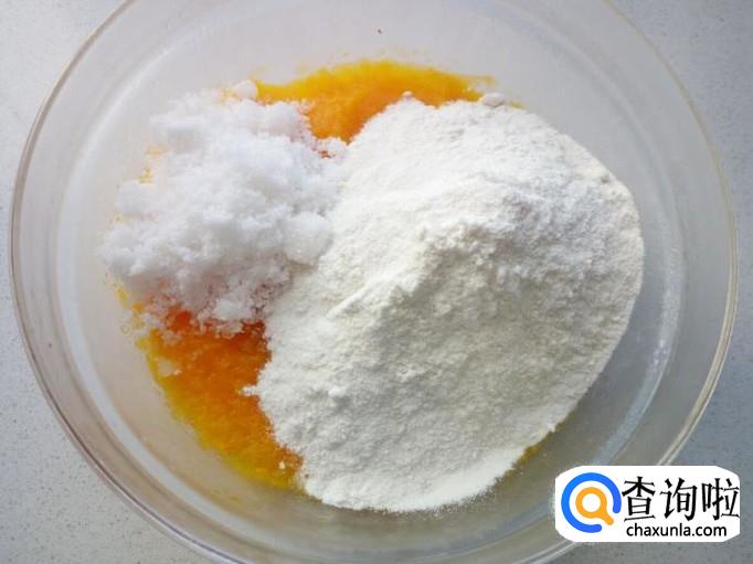 在捣碎成泥的南瓜里放入三匙儿白糖(白糖的量,根据个人的喜好掌握),放入一碗糯米面(糯米面不要一次放太多,要逐步添加,直到能揉成面团),揉成面团。