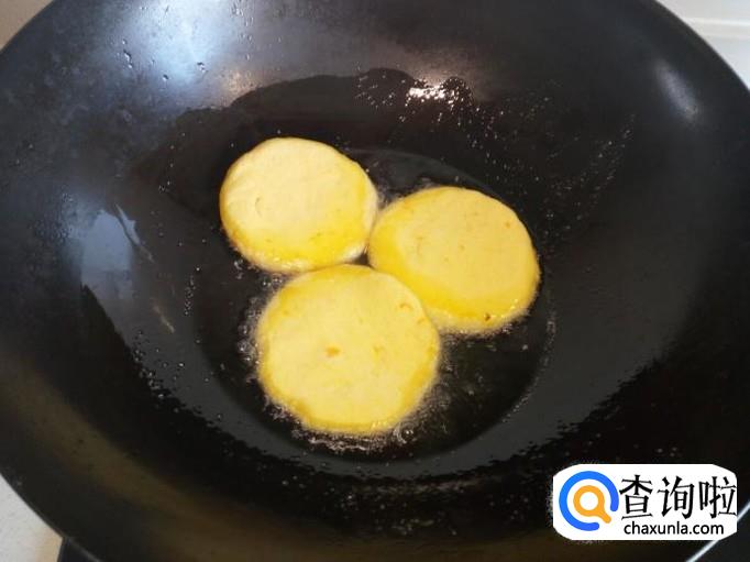 锅里放入适当的油加热,油四,五成热时,放入南瓜饼小火煎塌。