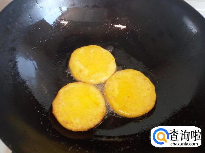 南瓜饼入锅煎塌至五,六秒钟的时间,再翻面煎塌五,六秒钟的时间。反复翻面煎塌三次,煎塌至表面焦黄后盛出,然后继续下锅煎塌其它的南瓜拼。