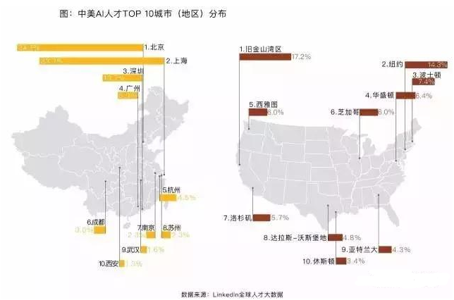 中国较大的人工智能公司中,事实上有一半是美国公司,43.9%的中国人工智能人才来自美国,他们中的许多人是从美国返回中国的美籍华人,英国是中国人工智能人才的第二大引入地,占15.3%。