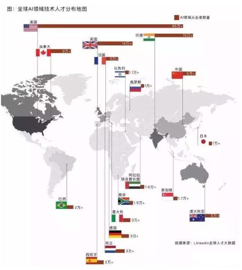 根据领英发布的《全球AI领域人才分布报告》中显示,全球人工智能行业的人才总计有150万,其中美国就有85万,占有了总人口的5成以上。而中国人工智能的人才,“逾5万”,排在全球第7。