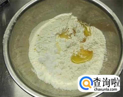 取三颗鸡蛋,加入适量的白糖、面粉、酵母粉、奶粉,一起搅拌均匀,揉成面团。