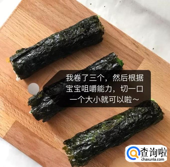 接着把所有的食材铺到海苔上面并卷起来,如图所示。