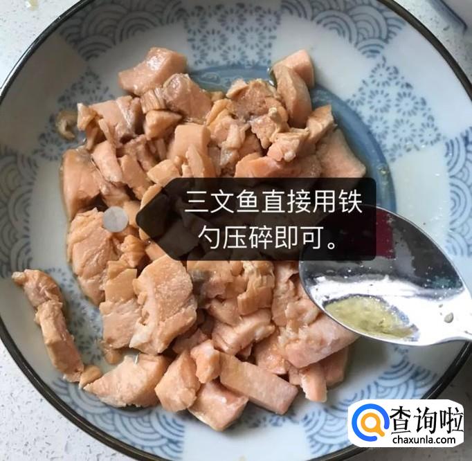然后把蒸熟的三文鱼直接用铁勺压碎,如图所示。