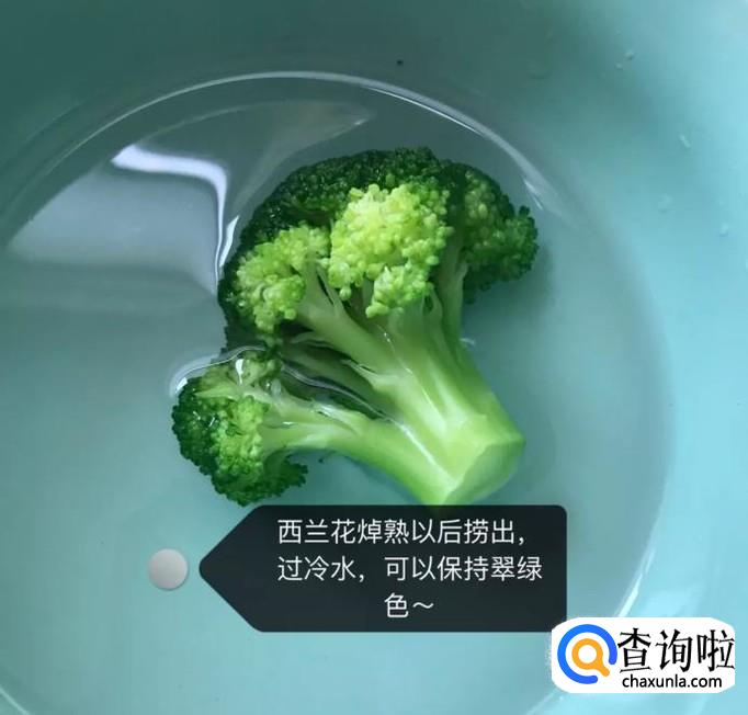 然后将焯好的西兰花过一下冷水,这样做能够保持西蓝花的颜色,如图所示。
